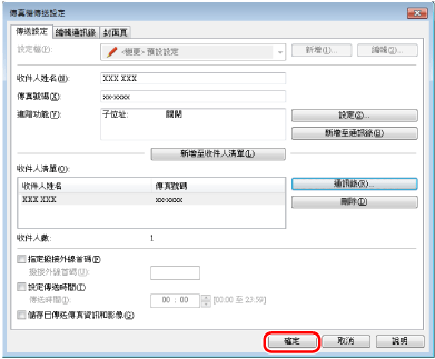 根據您添加的封面頁的情況,可確定每次傳送可同時選擇的接受者數目。有關詳細資訊,請查看說明(請參閱「檢視說明」)。