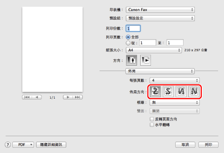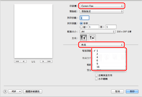 選擇傳真機→[佈局]→從 [每張頁數] 選擇要輸出在一張紙上的頁數。