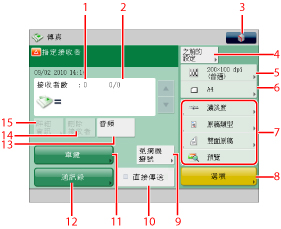 按下可以將文件直接傳送至接收者。若未選擇「直接傳送」,則使用「記憶傳送」。(請參閱「切換到直接傳送」)