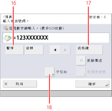 使用「遠端傳真組件」且已向遠端傳真伺服器添加電話線路時顯示。按下可以設定子位址和密碼,或者選擇用於傳送的電話線路。