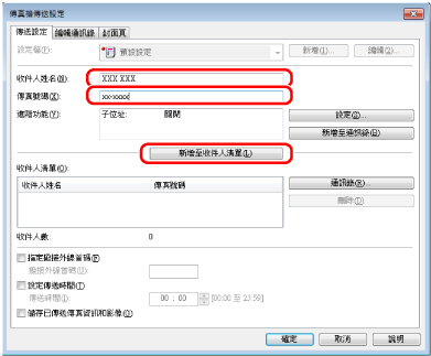 指定收件人姓名和傳真號碼→按一下 [新增至收件人清單]。