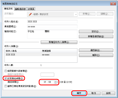 選擇[設定傳送時間]→指定傳送傳真的時間→按一下[確定]。