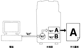 列印字母「A」時,主機電腦將一個對應「A」的代碼(此範例中是一個十六進位數字41)傳送到本機器。此代碼稱為字元代碼。本機器在內部為每個字元都儲存有一個圖案,並從這些字元圖案中選擇與已接收代碼對應的圖案。因此,本機器搜尋代表「A」的圖案並列印該圖案。列印字母的過程。