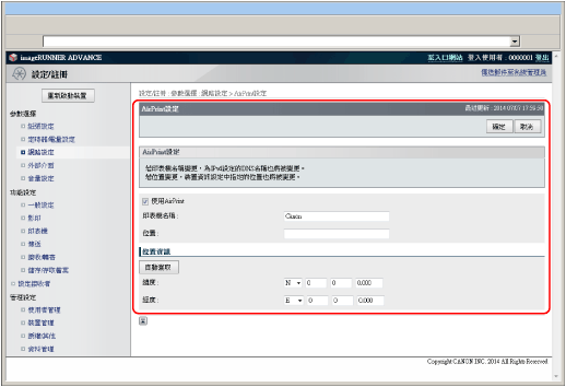 要檢查位置,請查看[裝置資訊設定] (「設定/註冊」的[管理設定]中的[裝置管理])中位置的值。