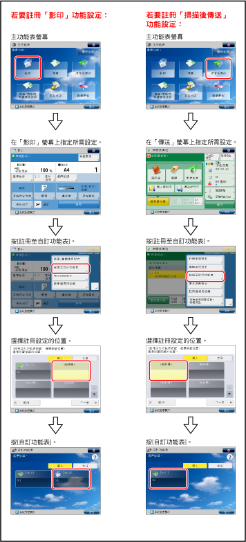 有關註冊「個人」按鈕/「共用」按鈕的說明,請參閱「註冊個人按鈕/共用按鈕」中以「掃描後傳送」功能為例的說明。