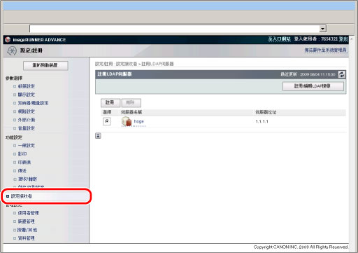 (設定/註冊)→[設定接收者]→[註冊LDAP伺服器]可存取的設定相同。有關使用控制面板指定LDAP設定的說明,請參閱「LDAP伺服器設定」。要指定LDAP伺服器設定,必須以管理員身分登入。