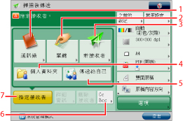 要顯示傳真接收者,請將[顯示傳真功能]的<在掃描後傳送功能中啟用傳真>設定為「開啟」。(請參閱「顯示傳真功能」)