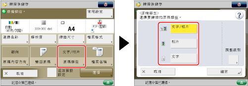 若原稿為投影片,則選擇原稿類型→將曝光調整到最適合於原稿的層級。