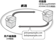 本機器可以作為用戶端機器存取網路上的伺服器機器以其「通訊錄」搜尋/指定接收者。