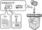 可以設定為使用所需傳送設定自動將符合指定轉寄條件的已接收網際網路傳真文件轉寄至任何接收者。可以將已接收網際網路傳真文件轉寄至其他機器(中繼功能)。也可以將自動轉寄設定為在指定時間啟用。由於不符合轉寄條件的已接收文件也可以轉寄至任何所需接收者,因此可以用該功能將已接收網際網路傳真文件分類,並傳送給合適的接收者。