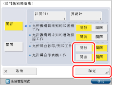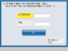若要在「自動(彩色/黑白)」或「自動(彩色/灰階)」模式下使用諸如「影印」/「列印」、「掃描後儲存」和「掃描後傳送」等功能,則必須輸入「部門識別碼」和PIN。若要在「黑白」模式下使用「影印」或「列印」功能,則不必輸入「部門識別碼」和PIN。