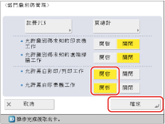 將<允許黑白印表機工作>設定為「關閉」,以拒絕來自不支援「部門識別碼管理」的印表機驅動程式的黑白列印工作。