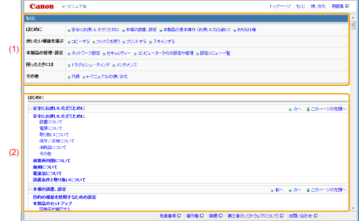e-マニュアルの全体もくじです。項目をクリックすると説明が表示されます。