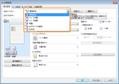 「お気に入り」を選択できない場合は、[コントロールパネル]からプリンターのプロパティ画面を表示して[お気に入り]タブをクリックしたあと、[お気に入りの選択を許可する]にチェックマークが付いているか確認してください。プリンターのプロパティ画面の表示方法については、「プリンターのオプション設定をする」を参照してください。