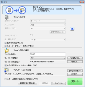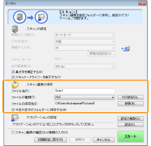 [スキャン画像]ダイアログボックスに読み込んだ画像が表示されます。以下の項目を参照して、ファイルの種類と保存先を指定してください。