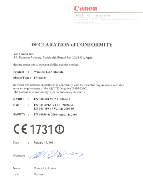 Hereby, CANON INC., declares that FM48944 is in compliance with the essential requirements and other relevant provisions of Directive 1999/5/EC.