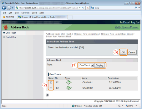 Select [One-Touch] or [Coded Dial] from the drop-down list and click [Display].