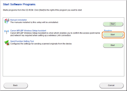 Click [Start] for [Canon MF/LBP Wireless Setup Assistant].