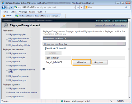 Cliquez sur [Réglages de sécurité] -> [Réglages certificat CA].