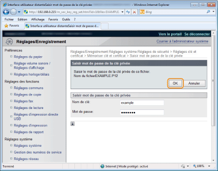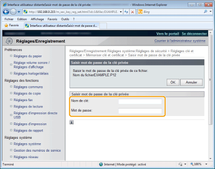Cliquez sur [Réglages de sécurité] -> [Réglages clé et certificat].