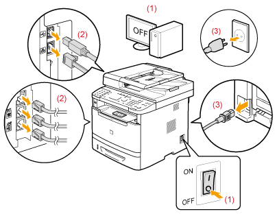 Se questi elementi cadono o vengono versati all'interno della macchina, spegnere immediatamente macchina e computer (1) agendo sul pulsante di accensione, quindi scollegare il cavo d'interfaccia, se collegato (2). Scollegare infine il cavo di alimentazione dalla presa di corrente (3) e rivolgersi al rivenditore autorizzato Canon di zona. ![]() |