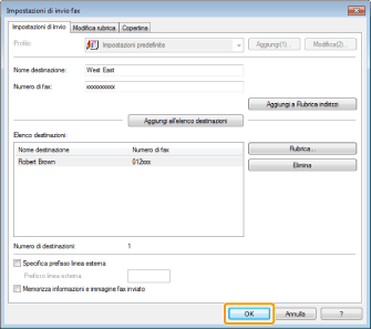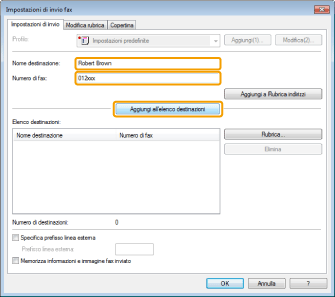 Se è stato selezionato [Prima di aggiungere la destinazione all'[Elenco destinazioni], inserire il n. di fax] nella finestra di dialogo [Impostazioni di protezione] della scheda [Speciale], selezionando [Aggiungi all'elenco destinazioni] viene visualizzata la finestra di dialogo [Confermare password]. Per informazioni dettagliate, consultare la Guida in linea (fare riferimento a "Visualizzazione della guida in linea (invio di fax da PC)").