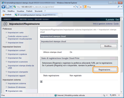 Fare clic su [Registrazione] in [Stato di registrazione Google Cloud Print].