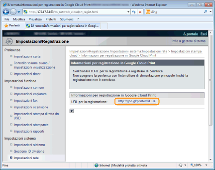Fare clic sull'URL del collegamento visualizzato in [URL per la registrazione].