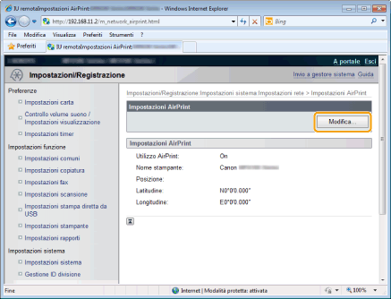 È possibile registrare una serie di informazioni, incluso il nome della macchina e la posizione di installazione, che possono essere utili per identificare la macchina. È inoltre possibile disattivare la funzione AirPrint della macchina. Utilizzare l'IU remota per modificare queste impostazioni.