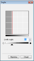 SogliaLa luminosità delle immagini a colori e grigie è espressa tramite un valore compreso tra 0 e 255, mentre la luminosità delle immagini in bianco e nero è espressa tramite bianco e nero, inclusi i colori compresi tra bianco e nero. Il confine che divide i colori in bianco e nero è chiamato "soglia".