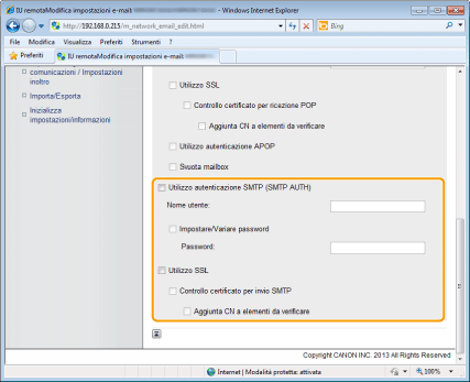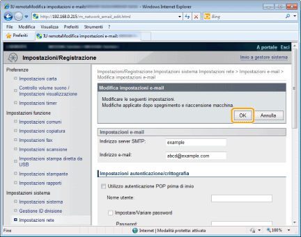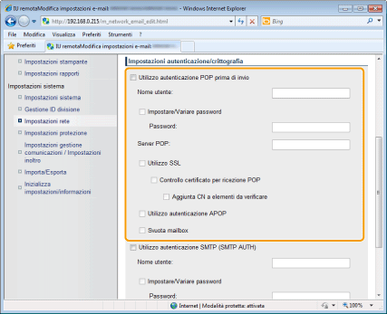 Utilizzare l'IU Remota per configurare le impostazioni di e-mail dettagliate, quali l'autenticazione POP prima di SMTP e la crittografia SSL. Per ulteriori informazioni sulle impostazioni richieste, rivolgersi al service provider Internet oppure all'amministratore di rete.