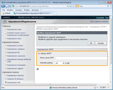 Selezionare la casella di controllo [Utilizzo SNTP] e specificare le impostazioni richieste.