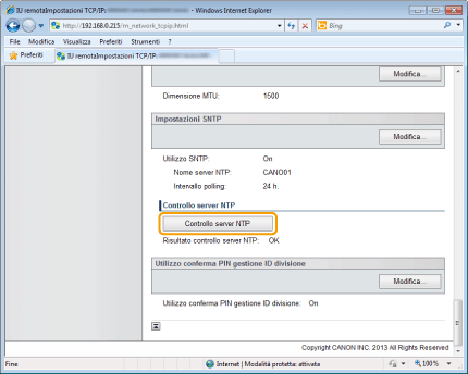 È possibile effettuare un test della comunicazione della macchina con il time server registrato via SNTP. Passare a [Impostazioni/Registrazione] [Impostazioni rete] [Impostazioni TCP/IP] e scegliere [Controllo server NTP] in [Impostazioni SNTP]. Se è stata stabilita una connessione corretta, il risultato visualizzato sarà quello mostrato sotto. Si noti che questa operazione esegue solo il test della comunicazione e non regola l'ora del sistema.