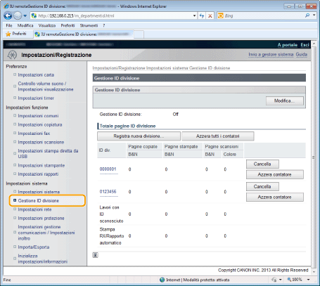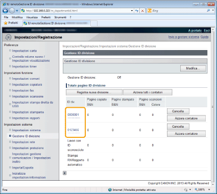 Fare clic su [Cancella] in corrispondenza dell'ID di divisione da eliminare.