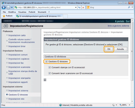 Selezionare la casella di controllo [Gestione ID divisione] e scegliere [OK].