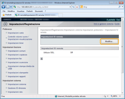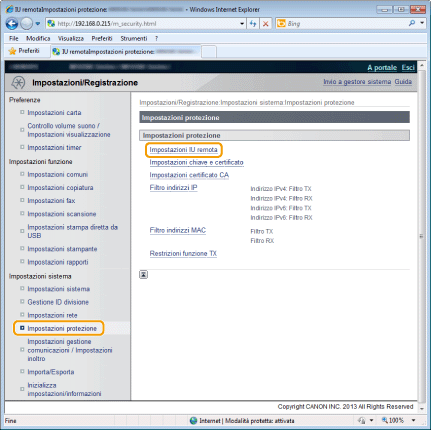 Fare clic su [Impostazioni protezione] -> [Impostazioni IU remota].