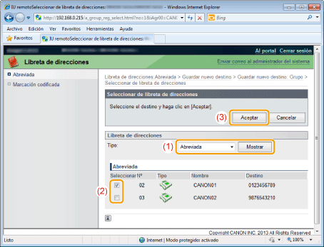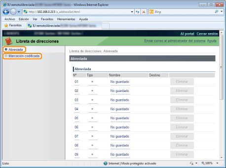 Haga clic en [Abreviada] o [Marcación codificada] en la lista desplegable y haga clic en [Mostrar].