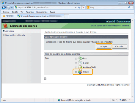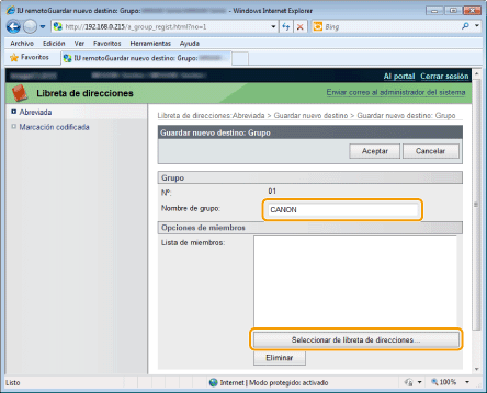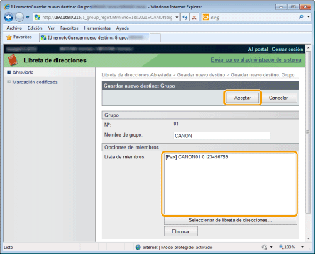 Asegúrese de que el destino registrado aparece en [Lista de miembros] y haga clic en [Aceptar].