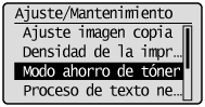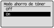 Cuando el <Modo ahorro de tóner> esté establecido en <On>Podrá ahorrarse la cantidad de tóner utilizado. Observe que la impresión podría no ser nítida, ya que los detalles sutiles como pueden ser líneas finas y colores claros podrían no reproducirse claramente.