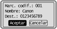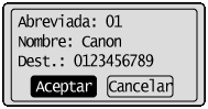 Si <Confirmación TX abrev./marc. codificada> está establecido en <On> y el destino fue especificado con las teclas de marcación abreviada o los códigos de marcación codificada, aparece la pantalla.