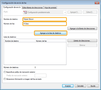 Si ha seleccionado [Reintroducir el número de fax antes de agregar el destino a [Lista de destinos]] en el cuadro de diálogo [Configuración de seguridad] de la ventana [Especial], se mostrará el cuadro de diálogo [Confirmar contraseña] al hacer clic en [Agregar a la lista de destinos]. Para obtener más información, consulte la ayuda en línea (consulte "Visualización de la ayuda en línea (PC Fax)").