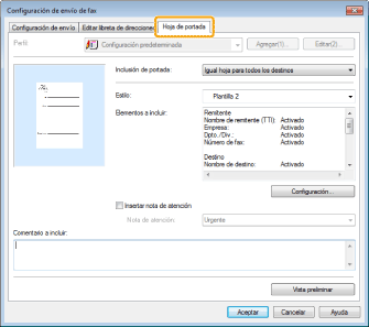 Para obtener una información detallada sobre cómo adjuntar una hoja de portada, vea la ayuda en línea (consulte "Visualización de la ayuda en línea (PC Fax)").