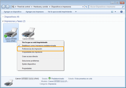 Haga clic con el botón derecho del ratón en el icono del fax cuyas opciones desee configurar -> haga clic en [Preferencias de impresión].