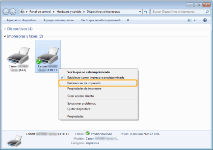 Haga clic con el botón derecho del ratón en el icono de la impresora cuyas opciones desea especificar -> haga clic en [Preferencias de impresión].