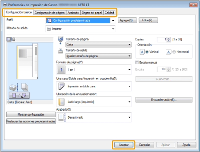 Especifique las opciones deseadas en la pantalla del controlador de impresora -> haga clic en [Aceptar].