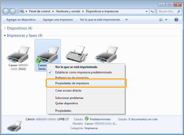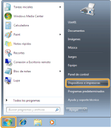 Configuración] → [Panel de control] → [Dispositivos e impresoras].Para Windows Vista, haga clic en [