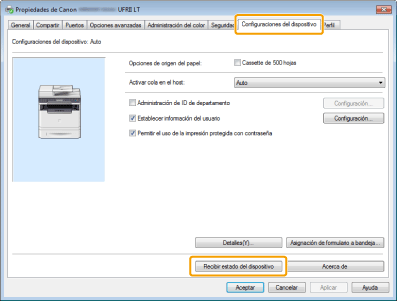 Si la impresora y el ordenador están conectados mediante un puerto USB o WSD (Web Services on Devices), la función [Recibir estado del dispositivo] no estará disponible. Deberá realizar la configuración manualmente.