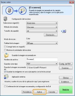 El documento se escaneará y se mostrará en la aplicación registrada. Aparecerá un cuadro de diálogo para cada uno de los botones.
