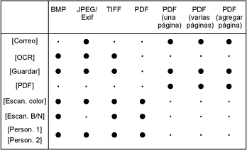 Formato JPEG/Exif (esta opción se encontrará disponible cuando se haya seleccionado [Escala de grises], [Color] o [Color (revista)] en [Modo de escan.]). [TIFF]