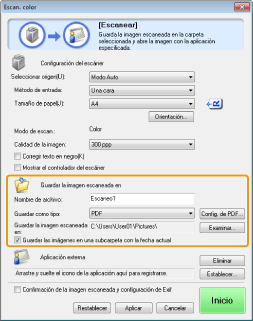 Muestra la ubicación en la que se guardarán las imágenes leídas cuando se seleccione una opción distinta de [PDF (agregar página)] en [Guardar como tipo]. Para cambiar la ubicación, haga clic en [Examinar], seleccione una carpeta y haga clic en [Aceptar].